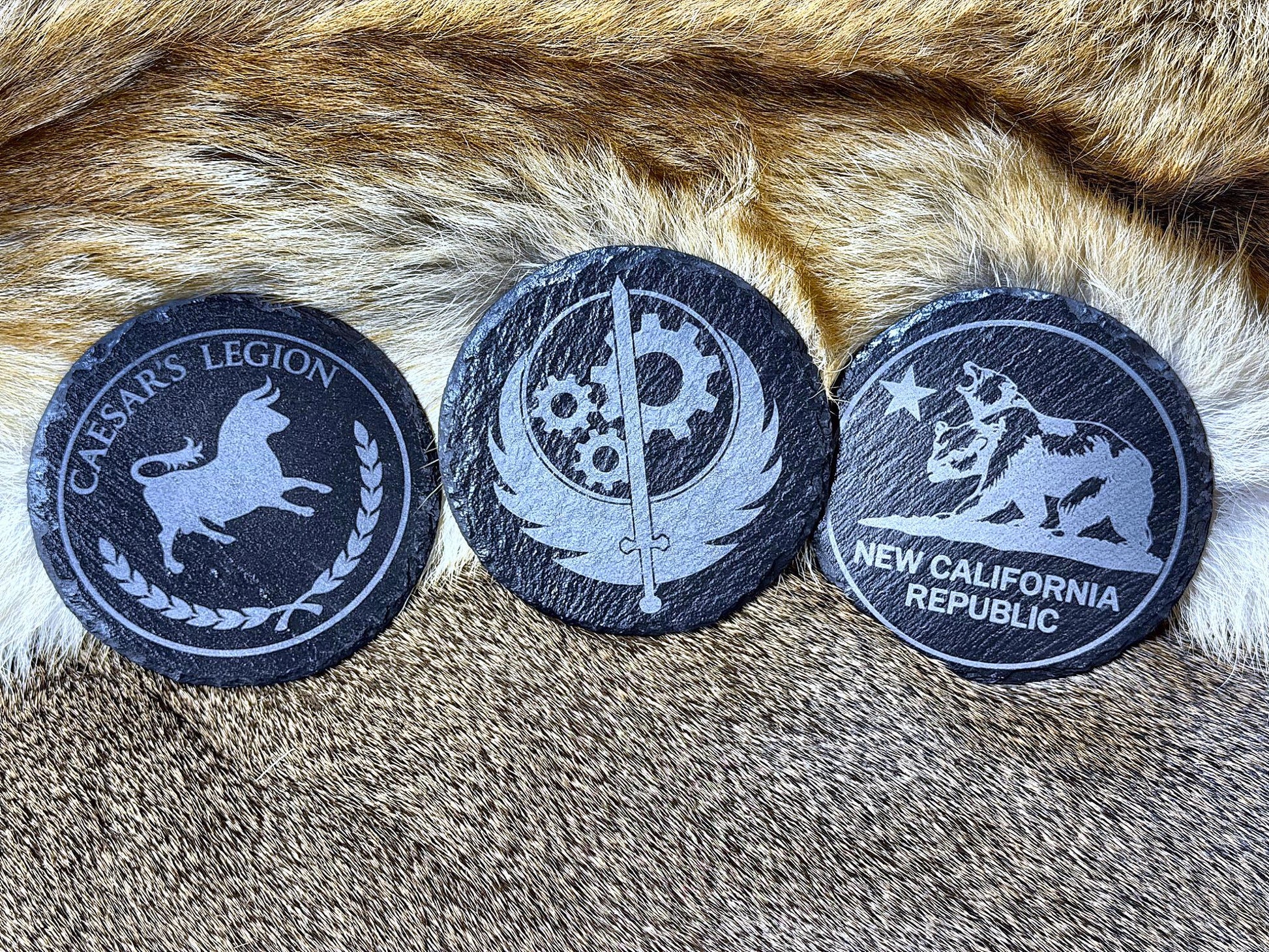 Bring wasteland vibes to your desk, bar cart, or game room with laser-engraved natural slate coasters inspired by classic Fallout-style factions and icons. Crisp, permanent engraving — won’t peel or fade like vinyl.